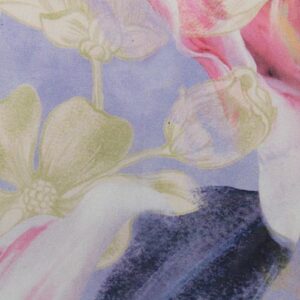 Tela satinada estampada con lirios en tonos lila, rosa y blanco