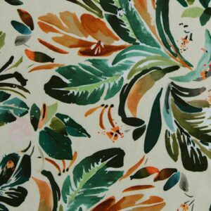Tela estampada tropical con hojas en tonos verdes y naranja – Ideal para prendas de verano