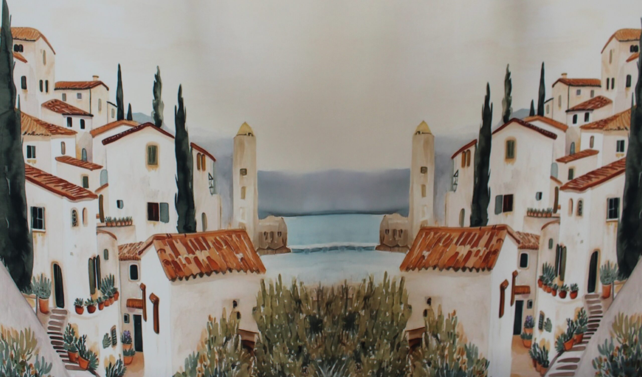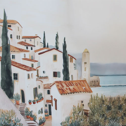 Si estás buscando un panel de tela estampado de paisaje con casas, este diseño es de los que marcan la diferencia desde el primer momento .