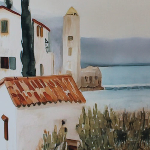 Un panel de tela con estampado de casas tipo paisaje que parece sacado de una postal .