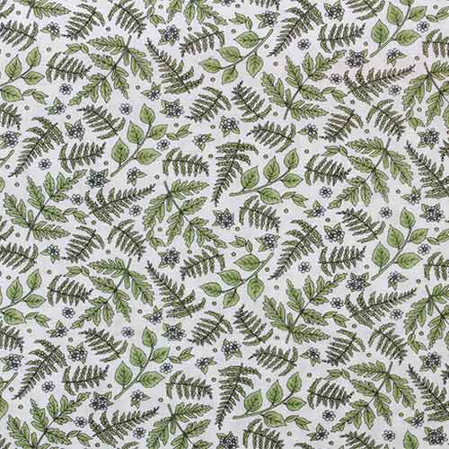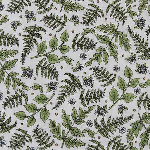 El estampado de esta tela presenta helechos. El fondo de la tela es blanco y los helechos tienen un color verde característicos. El tamaño aproximado de la hoja de helecho más grande es de 2,5 x 4 cm.