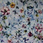 Tela de algodón estampada con fondo en tonalidades azules y lilas y flores en distintas tonalidades de rosa, lila y amarillo.