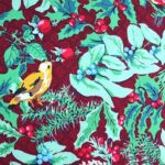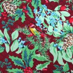 Tela de algodón con fondo granate navideño. En el estampado de la tela se presentan motivos navideños como acebos, piñas así como pájaros. El tamaño del pájaro amarillo es de 5 x 4,5 cm aproximadamente.