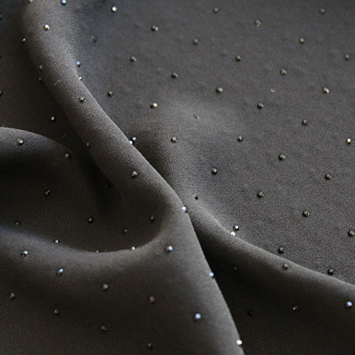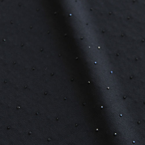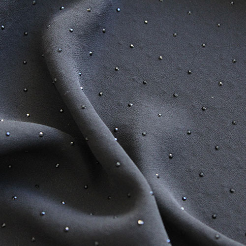 Descubre nuestra exclusiva tela blusera negra con pequeños brillantes, ideal para confeccionar prendas con un toque de lujo y distinción. Su diseño incorpora brillantitos negros de menos de 0,5 cm, aportando un efecto sutilmente luminoso y refinado sin perder la sobriedad del fondo oscuro.
