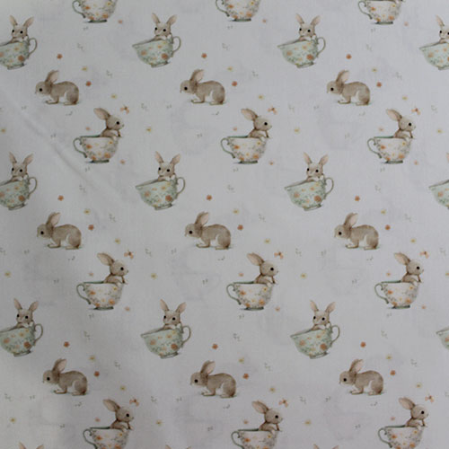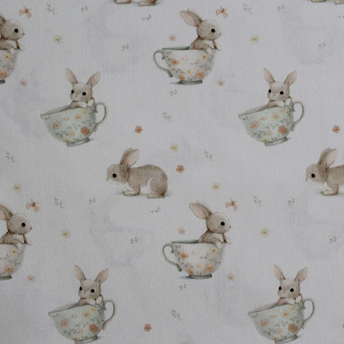 Estampado: Conejitos en tazas de café con florecitas y conejos sueltos