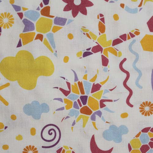 Estampado: Fondo blanco con estrellas, lunas, nubes y motivos inspirados en cerámica