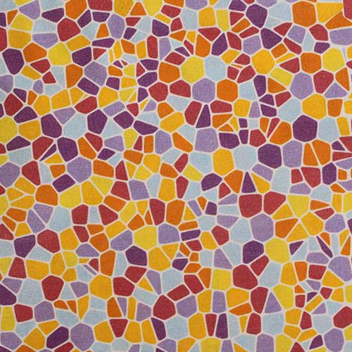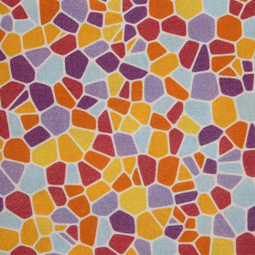 Esta tela de algodón con estampado tipo vidriera es pura alegría hecha tejido. Un diseño llamativo que juega con colores vibrantes —amarillo, naranja, lila, granate y azul— formando un mosaico creativo que recuerda a los cristales teñidos de una vidriera artesanal.