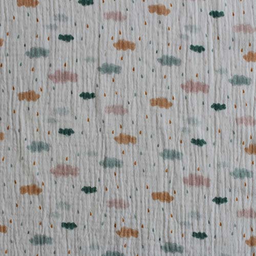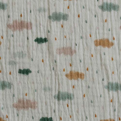 Una tela de doble gasa con estampado de nubes y gotitas que transmite dulzura y calma.