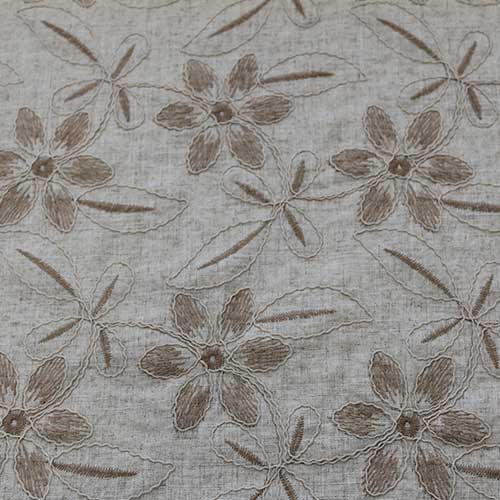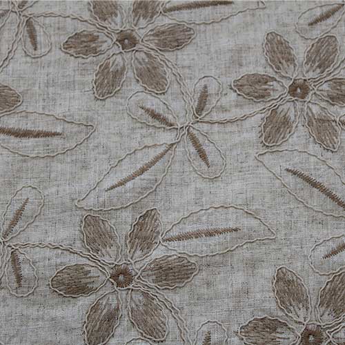 Una tela de lino con bordado floral en relieve que combina elegancia y naturalidad.