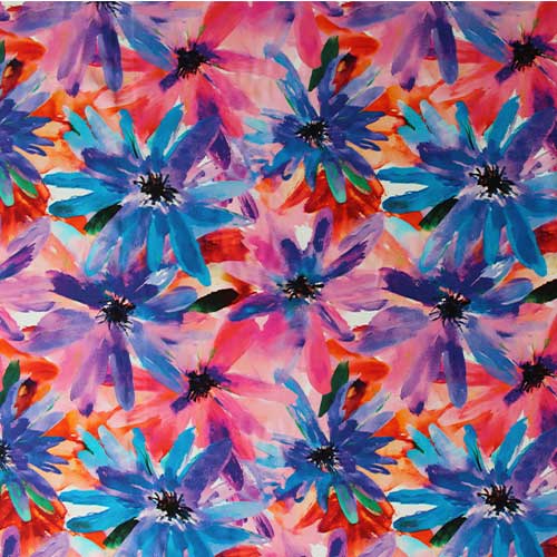 Su estampado combina flores de gran tamaño (23 x 20 cm aprox.) en una mezcla de colores vibrantes como rosa, azul, lila, naranja y verde, siendo el azul y el rosa los tonos predominantes. El resultado es una tela alegre, con presencia y perfecta para prendas veraniegas.