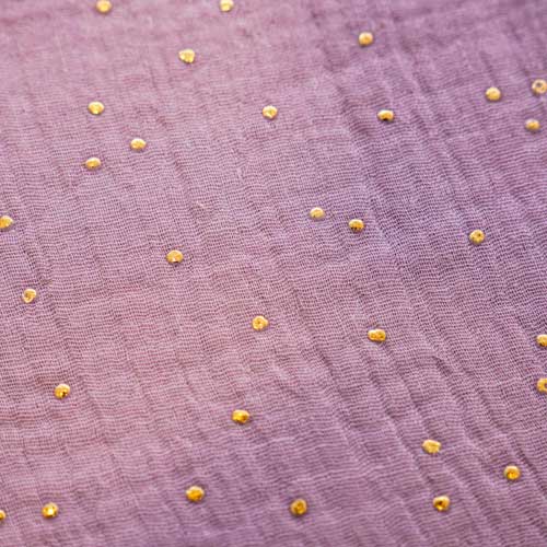 Tela doble gasa lisa puntos dorados metálicos – Malva