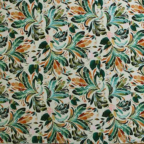 Una tela estampada tropical con hojas en tonos verdes y naranja que aporta frescura y color.
