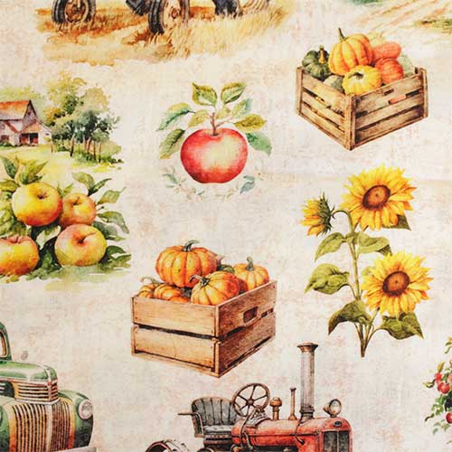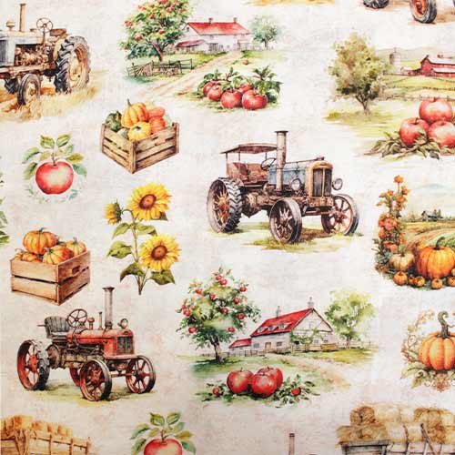 Dale un toque rústico y encantador a tus proyectos con esta tela de algodón 100% con un precioso estampado de granja. Su fondo en tono crudo marmoleado realza los distintos motivos campestres que la componen: paisajes rurales, casas de campo, tractores, calabazas y otros elementos icónicos de la vida en la granja.