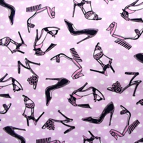 Tela con estampado de tacones. Se trata de una tela con fondo lila y topitos en color blanco. Sobre este fondo se presentan distintos modelos de tacones en negro y rosa. El tamaño aproximado de los tacones es de 4 x 3 cm.