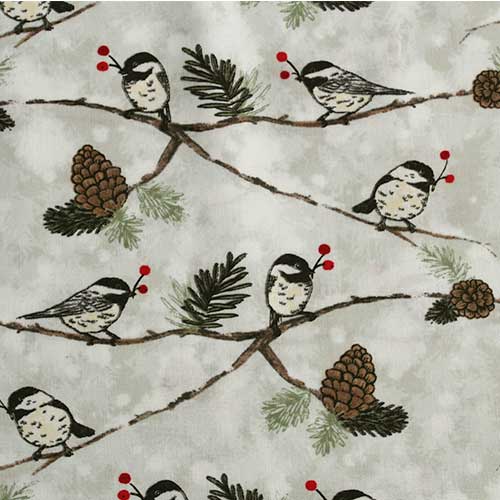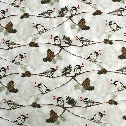 El fondo de esta tela no es uniforme si no que más bien es marmoleado. El color de este marmoleado es un grisáceo tirando a verde. Sobre este fondo se presentan ramitas con algunas hojitas de pino, piñas y simpáticos pajaritos. Cada uno de los pájaros presenta una ramita de acebo en el pico. El tamaño de los pájaros puede variar pero miden aproximadamente 3 x 2,5 cm.
