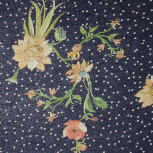 Punto estampado con flores . El fondo de esta tela es azul marino sobre el que se presentan pequeños topitos en color blanco. Además de los topitos se presentan flores así como racimos de las mismas. Los colores de estas flores son amarillo y naranja. En estas flores también se puede observar el color verde correspondiente a las hojas o tallos que acompañan a estas hojas. Las flores tienen un tamaño aproximado de 4 x 4 y los racimos de flores de 17 x 17 cm.