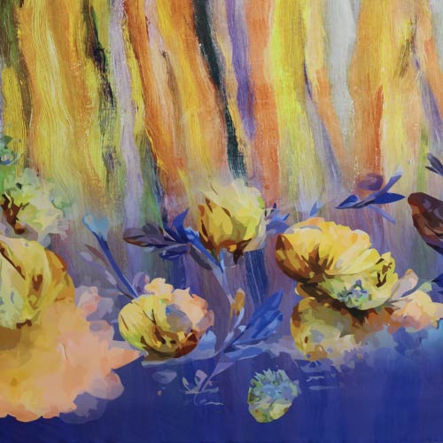 Su diseño combina un estampado asimétrico muy especial, donde las rayas en tonos verde, azul y amarillo se transforman en una espectacular cenefa floral. Las flores, predominantes en amarillo sobre fondo azul eléctrico, aportan un contraste vibrante y lleno de personalidad.