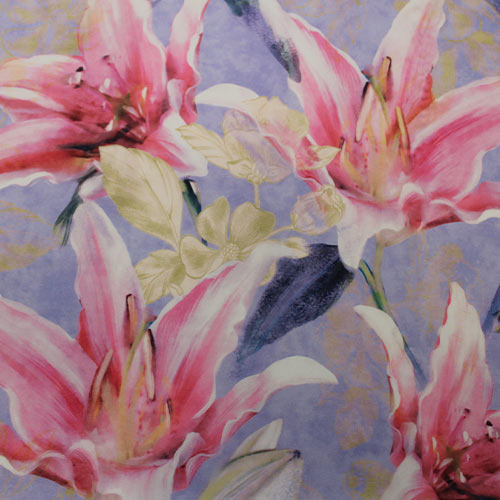 Tela satinada estampada con lirios en tonos lila, rosa y blanco