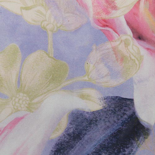 - Estampado: Lirios grandes (35 x 40 cm aprox.) en tonos rosa, blanco, amarillo y verde sobre fondo lila