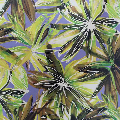 Una tela satinada con estampado floral grande en tonos pistacho, lila y marrón que no pasa desapercibida .