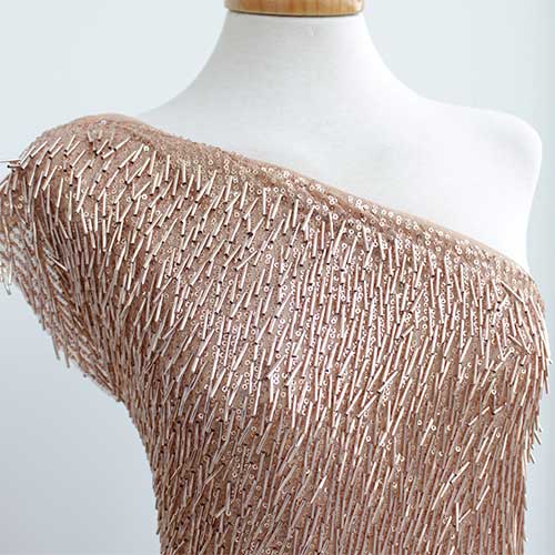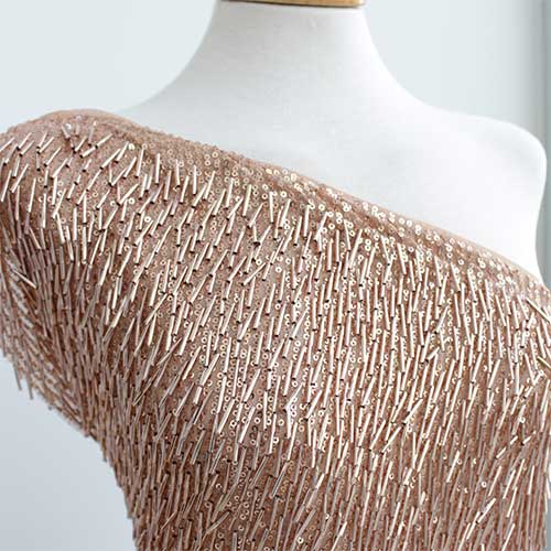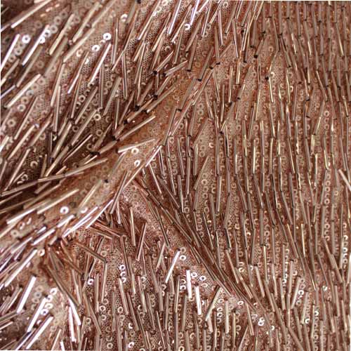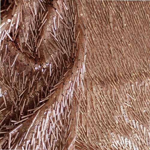 Descubre la exquisita tela de canutillo con pedrería en color bronce, una opción perfecta para eventos especiales y prendas de alta costura. Este tejido deslumbrante está totalmente cubierto de canutillos en tono bronce, complementados con pequeñas lentejuelas que aportan un brillo sutil y sofisticado. Su diseño refinado la convierte en la elección ideal para confeccionar vestidos, faldas y prendas de fiesta que destacan por su lujo y exclusividad.